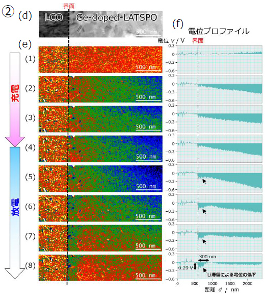 (e) 充放電中における電位マップ、(f) 電位プロファイル