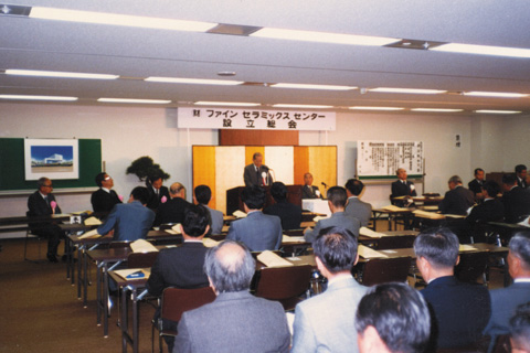 1985年4月22日、ファインセラミックスセンター設立総会が開かれ、直ちに財団法人としての設立許可を通商産業大臣に申請し、1985年5月7日に認可を得て正式に「財団法人ファインセラミックスセンター(JFCC)」が岩田弍夫会長((株)東芝相談役)、森田正俊理事長(トヨタ自動車(株)相談役)、阿久津一専務理事(中部経済連合会常務理事)以下の陣容で発足した。初代試験研究所長には、名古屋工業技術研究所(現 産業技術総合研究所・中部センター)出身の奥田博氏が就任した。同時に、JFCC の建物が完成するまでの仮住まいとして、名古屋市東区の名古屋栄ビルディングに事務所を開設した。