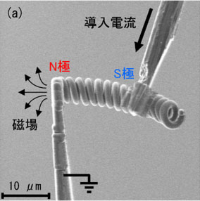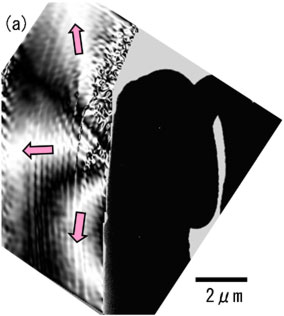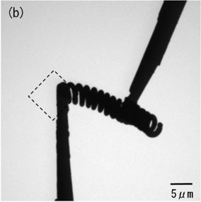| 概要 財団法人ファインセラミックスセンター(JFCC)は、最新の電子顕微鏡技術を用いて、世界最小となる超小型電磁気変換デバイス(ソレノイド)を開発することに成功した。デバイスの元となるコイルはカーボンマイクロコイル(CMC)を用いた。集束イオンビーム(FIB)装置を用いてこのコイルに金電極配線することにより、超小型のデバイスを作製、電子線ホログラフィにより電磁気変換デバイスとして機能することを確認した。 内容 FIB装置は、高エネルギーのガリウムイオンビームを用いて、透過型電子顕微鏡(TEM)用の薄片試料を迅速に作製する装置である。この装置を用いると試料の薄片化だけでなく、「マイクロサンプリング」と呼ばれる手法で観察したい部分を大きな試料から切り出したり、その試料に電気配線したりすることができる。図1 (a)は、無数にあるCMCの束から一本だけを取り出し、その両端に金電極を配線した像である。このデバイスは、TEM用の電圧印加ホルダーに直接取り付けてあるため、TEM内で電流を流すことができる。図1 (b)にTEMで観察した像を示す。 電子線ホログラフィは、微小領域の電場や磁場を直接観察することができる特殊な電子顕微鏡技術であり、この技術を用いて電流によって発生した磁場を直接観察した。図2 (a)、 (b)は、デバイス先端から漏れ出た磁場の様子である。導入した電流量に従って発生している磁力線が密になっており、磁場が強くなっていることを示している。 図3に、導入した電流に対する測定磁場のグラフを示す。実線は理論によって計算された磁場である。理論通りに磁場が発生し、電磁気変換デバイスとして機能していることが証明された。今後、このデバイスをマイクロマシンのアクチュエーターや、電子顕微鏡用マイクロ磁場発生装置として応用されることが期待される。 発表・受賞 1. K. Yamamoto, T. Hirayama, M. Kusunoki, S. Yang and S. Motojima, Ultramicroscopy, 106 (2006) 314. 2. JFCC NEWS No.89 (2008) 5. 3. 日刊工業新聞, 2008年4月30日付 掲載 4. 日本セラミックス協会 2008年 学術写真賞(最優秀賞)受賞 |