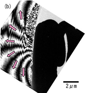| 図2 電子線ホログラフィを用いて,コイル先端で直接観察された磁場 導入電流:(a)4.5 mA,(b) 14.0 mA。 電流の増加に伴って,磁力線が増えていることがわかる。 |