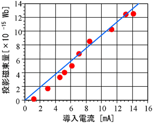 | 図3 導入電流ー計測された磁束量 青実線は、理論値。 |
