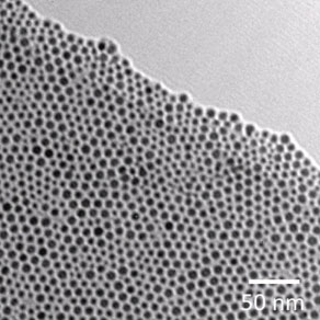 観察に用いた試料は、直径8ナノメートルのコバルト(Co)粒子を規則的に配列させた膜です。これらのナノ粒子は、コバルトカルボニル化合物(Co2(CO)8)を含む液体を熱処理することによって作製されます。その後、粒子を含んだ混濁液を水面上に滴下することにより、粒子が自動的に規則配列して膜を作ります。図1は、その膜をすくった試料の透過型電子顕微鏡像です。