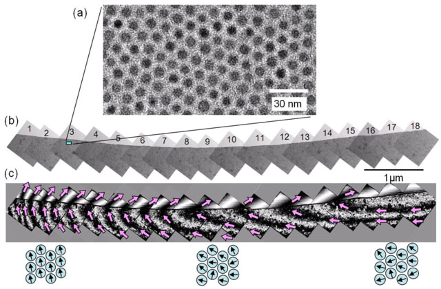 磁性ナノ粒子膜の切れ端付近(約6ミクロン長)の領域を、電子線ホログラフィーで観察しました。図2(a) - (c)に、その部分の高倍率電子顕微鏡像、低倍率像、電子線ホログラフィー像を示します。図2(c)の矢印は、磁化の向きを示しており、白黒の線は磁力線に相当します。ミクロンオーダーの非常に大きな渦状磁区構造が形成されていることがわかります。この渦状の磁区によって、全体の磁気的エネルギーを下げていると考えられます。また、各粒子の磁化ベクトルは、図2(c)下の模式図に示したように、場所によってベクトルの向きがふらついたり、100%同じ方向を揃ったりしていることが明らかになりました。