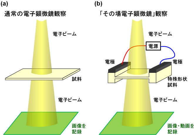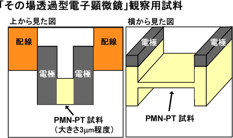 | 図1.(a)通常の透過型電子顕微鏡観察と(b)「その場透過型電子顕微鏡」観察の模式図。「その場透過型電子顕微鏡」観察では試料に電圧をかけながら観察を行う。今回の実験では6V程度の電圧をかけながら観察を行った。 「その場透過型電子顕微鏡法」は試料に電圧を加えるなどの外的な刺激を与えながら電子顕微鏡観察を行う手法(図1(b))でドメインの応答を見るのに適した方法の1つであろうと考えられてきましたが、この実験は非常に高度な技術が要求されるために実際に観察を成功させるのは困難を極めていました。これに対して、私どもは観察用の試料のデザインを最適化することが実験成功の大きなキーポイントであることを発見しました。そこで、図2に示すような特殊な形状を持つ試料をデザインし、収束イオンビーム法という微細加工技術を用いて作製しました。 |