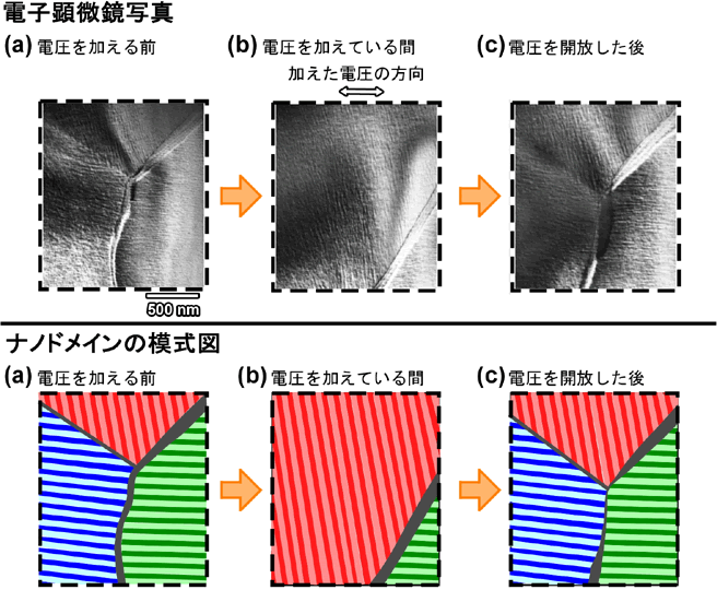 | 病気の診断などの際に用いる方法の1つとして画像診断があります。その際に用いる装置には超音波診断装置、X線診断装置、X線CTなどがありますが、超音波診断装置は比較的小型で安価であることや診断対象の部位が広いことなどのメリットがあるために広く用いられています。超音波診断装置の性能は超音波プローブ(注1)と呼ばれる素子、中でも特に、圧電材料(注2)と呼ばれる材料の性能によって大きく左右されます。したがって、将来、病気の診断をより正確に行ったり、より小さな病巣を発見したりするためには、より高性能の圧電材料の開発が必要となります。そのためには圧電特性を発現させるメカニズムの理解が必須であり、世界各国の研究者がしのぎを削って研究を行っています。 代表的な圧電材料の1つとして、マグネシウムニオブ酸鉛とチタン酸鉛を混合した物質である圧電セラミックス(PMN-PT)(注3)の単結晶があります。この材料は通常の圧電材料であるチタン酸ジルコン酸鉛を大きく凌駕する巨大な圧電特性を示すため超音波プローブに実際に用いられています。これまでに行われた様々な研究の結果から、PMN-PTの材料内部はドメイン(注4)と呼ばれる数十ナノメートル程度の大きさの微小な領域に分割されることが明らかになってきましたが、圧電特性発現メカニズムの詳細は分かっていませんでした。そのメカニズムを本当に理解するためには各ドメインが電圧を加えた時にどのように応答するかを理解することが非常に重要な鍵となります。そのためにはドメインが実際に応答している様子をリアルタイムで直接観察することが必要となりますが、これまでにその観察に成功した例はありませんでした。 上記に述べたドメインなど材料内部の構造をより細かく観察する非常に強力な手段の1つとして、透過型電子顕微鏡法があります(図1(a))。この手法を用いるとナノメーターサイズの非常に小さなナノドメインの観察も可能であります。電圧をかけていない静的な状態の観察はこれまでにも行われておりましたが、電圧を加えた時の変化を見るといった動的な観察につきましてはこれまでに成功例がありませんでした。本研究では、透過型電子顕微鏡法および材料に電圧を加えながら観察を行う「その場観察法」を融合させた「その場透過型電子顕微鏡法」の新しい実験手法を提案して実施しました。その結果、ナノドメインが電圧に対して応答する様子をリアルタイムで直接観察することに世界に先駆けて成功しました。 |