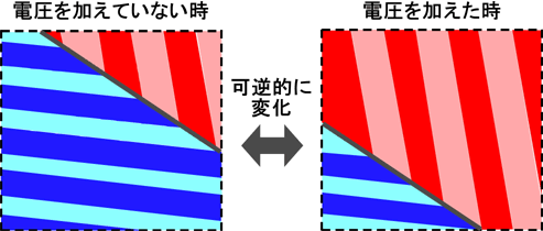 | 図4. 今回の実験で明らかになったメカニズムの概念図。異なる色の場所が異なる方向を向いたドメインを示す。電圧を加えることによって、向きの違うナノドメインの割合が変化する。 |