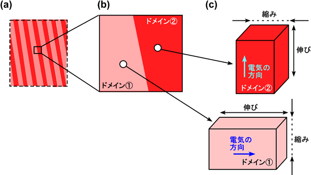 | 図5. 圧電材料におけるドメインの模式図。(a)は図3に示す模式図の一部で、赤やピンクで示す1つ1つの領域が1つ1つのドメインである。(b)に示すのはその一部を更に拡大したもので2つの隣り合うドメインを示している。隣り合うドメインでは材料の伸び縮みや電気分極の方向が異なっており、例えば、(c)に示すようにドメイン?では電気分極や伸びの方向が左右方向であるのに対して、ドメイン?では上下方向になる。 |