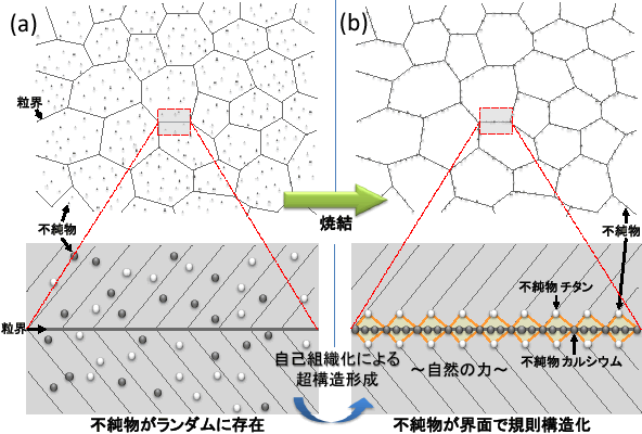 図 1 粒界における不純物の超構造形成メカニズム : (a)焼結前、(b)焼結後