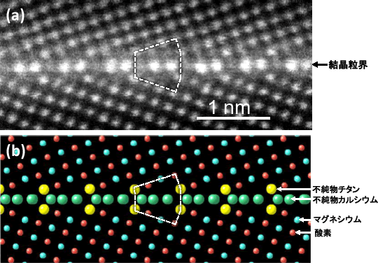 図 2 粒界に不純物原子が規則配列した「超構造」を捉えた写真 (a)とその模式図(b)