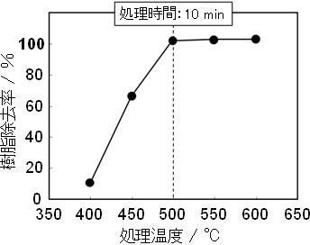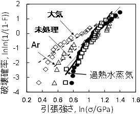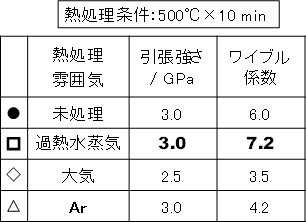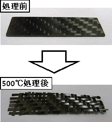過熱水蒸気を利用するさらなる利点として,酸素濃度が低い状態での熱処理が可能であるということが挙げられます。したがっ、CFRPを処理する場合、繊維の酸化劣化を防ぎ、樹脂だけを効率的に除去できることが期待されます。実際に、熱可塑性樹脂のひとつであるポリアミド66を母材とするCFRPを500度以上の過熱水蒸気で短時間処理することにより、織物状態で繊維を回収することに成功しております(図1,2)。さらに、過熱水蒸気処理によって回収した繊維は、他の熱処理法と比較して、強度の低下とそのばらつきが小さいことを明らかにしております(図3)。