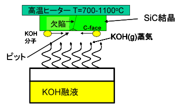 そこでJFCCではトヨタ自動車株式会社と共同で、簡単に欠陥のある場所、種類、密度を見分けることのできる腐食ガスエッチング法を開発した。このエッチング法は図2に示す様にKOHの蒸気にガスに結晶をさらす方法であり欠陥のある所は弱いので腐食されやすく、窪み(ピット)ができるので、この窪みの位置や数、形で欠陥の場所や種類そして密度がわかる方法である。この腐食ガスの種類や、温度を検討し欠陥を検出する方法を開発した。詳細はECSCRM2012で発表する。