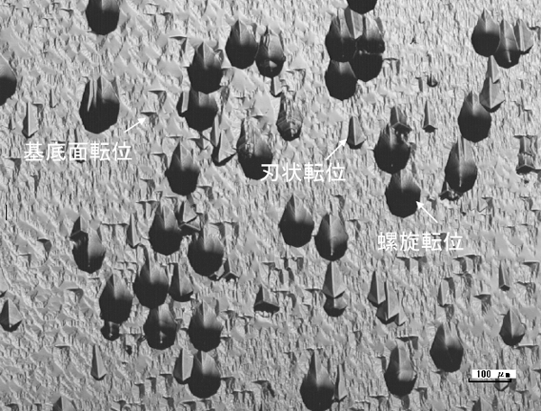 この方法でSiC材料を評価した顕微鏡写真を図3に示す。図3には大小2種類の六角形の黒い窪みが見える。大きな六角形は貫通らせん転位、小さな六角形は貫通刃状転位と呼ばれる欠陥が示されている。この2つは装置性能を低下させるが、有害度は低い。三角形に見えるものは基底面転位と呼ばれる欠陥でこれがデバイス性能を低下させる今一番問題となっている欠陥である。この様に欠陥の種類、数、場所を簡単に見分けることができる技術である。この技術によってSiC材料の品質、装置の性能、寿命が向上し、更なる低価格化が進むことが期待される。