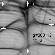 | 炭化珪素(SiC)結晶の螺旋転位とよばれる欠陥の特異な構造を解明した。本研究成果は9月25-27日に京都で開催されるSSDM2012で発表する。 ガソリンの価格の高騰や原子力発電所の事故によって、自然エネルギーを利用した発電が重要になってきている。しかし太陽電池など自然エネルギーで作った電力は直流のものが多く交流に直して使わないといけない。そのためには、インバータと呼ばれる装置が必要になってくる。このインバータはシリコンと呼ばれる材料で作られてきたが、最近の用途を満たすだけの性能を引き出すことは難しい。 代わりの材料として炭化ケイ素(SiC)と呼ばれる材料が注目を集めている。SiCでインバータを作ると電力消費を小さくできるので、無駄になる電気エネルギーを1/10にすることができる。また、高温でも安定して動作するため冷却設備がいらず、同じ容量でサイズは数百分の1になる。これを使うと、太陽光発電で作った電力を無駄なく使ったり、電気自動車やハイブリッド車の燃費を小さくすることができる重要な材料である。 SiC結晶の中に欠陥があると設計通りの性能が発揮できず、短寿命化、不良率の上昇などが起き、高品質なものを低コストで作ることができない。欠陥を減らすためには欠陥の構造を正確に知ることが第一歩となる。欠陥の一種であるらせん転位は、欠陥の延びる方向と結晶のずれ(変位)が同じと考えられているが、SiC結晶内を貫通するらせん転位には、欠陥の延びるc軸方向に加えてc軸に垂直な方向(a軸)の変位も併せもつ特異な転位があることが示唆されており、この欠陥はインバータの性能を損なうキラー欠陥と考えられる。しかし、この欠陥の存在が明確には証明されていなかった。 そこでJFCCではトヨタ自動車株式会社、株式会社豊田中央研究所と共同で、透過型電子顕微鏡を使った解析方法-大角度収束電子線回折法と呼ばれる方法−を用いてらせん転位の構造を評価した。この方法で転位を観察すると、図の転位(矢印Dの線)のまわりに干渉縞が現れる。この縞の数(図中n)と観察に使った結晶面(図中g)と転位の変位(b バーガースベクトル)にはg・b=nという決まった関係がある。図(a)−(c)の観察で3式が立つので、この連立方程式を解くと転位の変位bが決まる。この解析によってc軸方向だけではなく、a軸方向にも変位をもつ転位があることが証明された。異方性の大きなSiC結晶中にこのタイプの欠陥が存在することは、従来の理解の範疇では考えにくく新たな知見である。詳細は、9月25-27日に京都で開催されるSSDM2012で報告する。 本手法は欠陥のバーガースベクトル*の方向だけではなく、向きと大きさまで正確に決めることができることが特長である。 欠陥構造の解明によってSiC材料中の欠陥密度の低減がなされ、SiCの品質、装置の性能および寿命が向上し、低価格化が進むことが期待される。 |