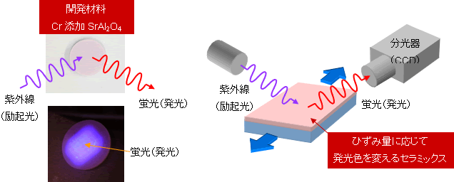 図1. 開発材料Cr添加SrAl2O4の外観と、ひずみ検出のイメージ