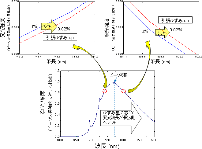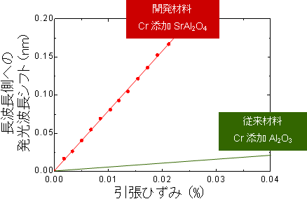 図2. 開発材料Cr添加SrAl2O4の蛍光スペクトルと、引張ひずみによる発光波長シフト