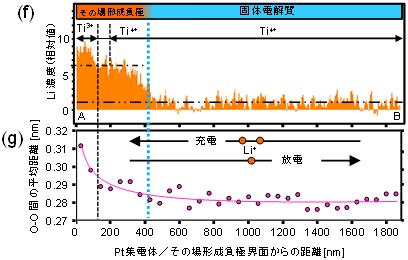 | 図1 (a)全固体LIBの模式図.充電時、Liイオンが負極側に溜まることによって固体電解質が分解し、その場形成負極が形成される。 (b)負極が形成された後のTEM像。コントラストが異なった層(アモルファス層)が観察できる。 (c)LiのSR-EELS像。Ptに近いほど高い濃度のLiが溜まっていることがわかる。 (d)TiのSR-EELS像。Tiの2本のスペクトルが左へ急にシフトしており、LiによってTi4+ → Ti3+に電子状態が変化していることを示す。 (e)OのSR-EELS像。Oのスペクトルも、Li濃度が高い領域で左へシフトしていることがわかる。つまり、Oの電子状態も変化している。 (f)Li濃度分布((c)のA-B間)とTi3+、Ti4+の領域。 (g)Liが高濃度に溜まることによってO - Oの平均距離が0.03 nm大きくなっていることがわかる。つまり膨張していることを示す。 |