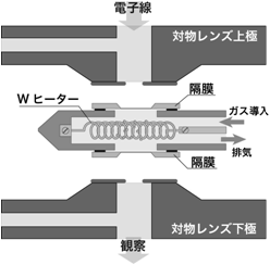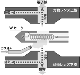 環境電子顕微鏡:対象試料をガス中に保持したまま観察することが可能な電子顕微鏡。通常の電子顕微鏡では真空中で試料が保持されガス中での観察不可能であるが、環境電子顕微鏡では試料近傍のみにガスを封じることにより観察を可能としている。 |