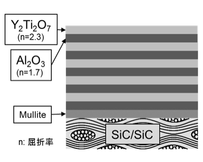 高温の輻射熱を反射する機能は、i) 屈折率差が大きく、かつ、ii) 高温でお互いが反応しない二種類の耐熱性酸化物を交互に積層させることで、電磁波の干渉効果により発現します。本研究では、この積層コーティング膜が1300℃で使用されることを想定し、上記条件を満たす組み合わせとしてY2Ti2O7とa-アルミナを選定しました。コーティング全体としての構成は、CMC基板側から順にCMC/ムライト結合層/[アルミナ/Y2Ti2O7]nとなります。
