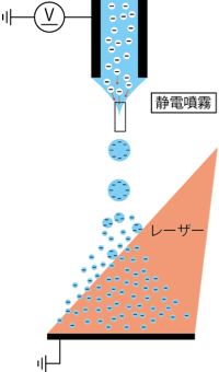 | 静電噴霧では、直径数〜10ミクロン程度の帯電した液滴が生成します。液滴表面からの蒸発で液滴が小さくなると、液滴内の電荷間距離が小さくなり、電荷間の反発によって液滴は徐々に不安定になります。この静電反発が液滴の表面張力を上回ると、液滴は分裂し、さらに微細な液滴が生成します(レイリー分裂)。レイリー分裂は、液滴が単電荷になるまで繰り返され、最終的にはナノメートルサイズの微小液滴(ナノミスト)が生成します。 このナノミストを、高温に加熱した基材に供給してCVDコーティング(いわゆる熱CVD)すると、成膜初期では緻密なコーティングができましたが、厚みが増すにつれて粉が降り積もったような粗い組織となり、膜質は低下しました。これは、成膜中の温度低下によるものであり、成膜開始直後は850℃程度だった表面温度は、ナノミストの供給開始とともに数分間で500℃程度まで低下してしまいました。このような温度低下は、加熱していないナノミストを供給したことと、膜形成反応によって熱が奪われたためであると考えられます。そこで、成膜中にレーザーを反応部位に照射して、基材の温度低下を抑制することを試みました(図1)。その結果、膜質の低下は解消され、均一な構造を持つコーティングが得られるようになりました。 現在、高硬度コーティング材料として有用なアルミナのコーティング実験を進めており、アルミナの中で最も高硬度のα−アルミナを、一時間に200ミクロンの高い成膜速度でコーティングできることを明らかにしています。この成膜速度は、従来CVD法の20倍程度の高い値です。 大気圧中で、高速でセラミックスコーティングが可能となる本技術は、航空機などの工業用大型部材への低コスト厚膜コーティング技術として、実用化が期待されています。 |