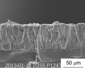 | 化学気相析出(以下、CVD)は、主に半導体などの薄膜製造プロセスとして用いられています。一般的には、原料を減圧下で数百度に加熱して蒸気化し、真空の反応容器内に導入して成膜します。このため、大型部材へのCVDコーティングでは部材を格納できる規模の減圧容器が必要となり、装置コストが増大する問題があります。 固体原料の溶液を静電噴霧すると、大気圧中で、加熱せずに、極めて小さな液滴(ナノミスト)を生成することができることに注目し、減圧容器不要のCVDプロセスを目指して、「静電噴霧CVD」の開発を開始しました。 しかし、この方法ではコーティングが不均質になりやすく、コーティング厚が増大すると粗い組織になることがわかりました。これは、成膜中に基材温度が大幅に低下していることが原因でした。 そこで、レーザーを用いて成膜中の温度低下を抑制する手法を静電噴霧CVDに導入し、その結果、均質な膜を得ることに成功しました。さらにこの方法では高速成膜が可能であり、例えば、高硬度コーティングに用いられるアルミナでは、一時間に0.2ミリの高速で成膜することにも成功しています。 |