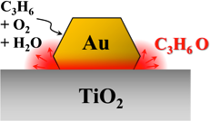 撮影した動画からピックアップした像を図2に示します。いずれも中央の黒い粒子が金で、その下部に酸化チタン基板が映っています。(a)は触媒反応が起こる前の像で、金・酸化チタンとも表面には何も生じていません。ここにガスが導入されて反応が始まると(b)の矢印で示す部分に反応生成物が発生しました。この物質はガス分析などの結果から、プロピレンオキサイドであることが分かりました。一方、ガス供給を止めて試料の周囲を真空に戻すと、(c)のように触媒表面からプロピレンオキサイドが消失することが確認されています。以上の結果から、金ナノ粒子触媒の反応サイトは、図3のように『金と酸化チタン基板の接合界面周囲』であることが判明しました。これは、提案されていた反応モデルの中のひとつと符合しており、その妥当性を直接証明する成果と言えます。