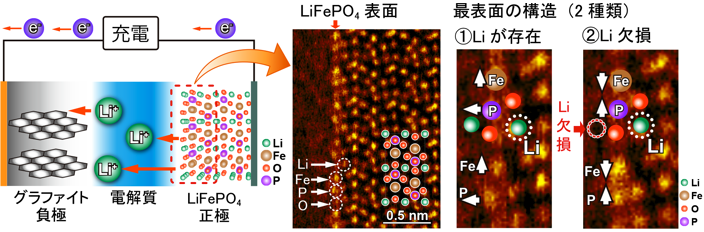 | リチウムイオン二次電池の充電反応の模式図と正極材料LiFePO4の表面構造観察結果 (表面構造がリチウムイオンの有無により異なっている) |