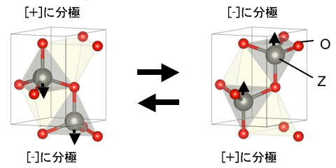 外から電場を与えると、電荷の偏りが電場と同じ方向になるように亜鉛(Zn)が動く。 |