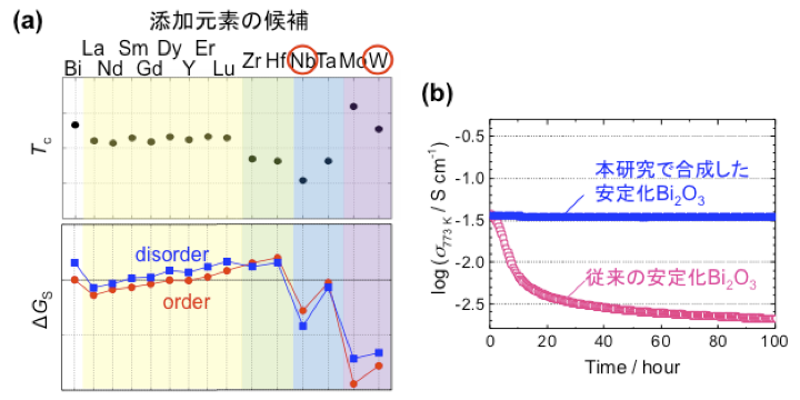 ファインセラミックスセンターの設樂研究員らは京都大学・NIMSと共同で、材料と情報科学の融合であるマテリアルズインフォマティクス(注2)を活用し、第一原理計算(注3)と実験を組み合わせて高安定性・高イオン伝導体の開発に成功しました。本研究では、安定性に課題があるBi2O3を対象としました。まず、網羅的な理論計算によりデータベースを作成し、Bi2O3を安定化する元素を探索しました。その結果、ニオブ(Nb)とタングステン(W)という元素が安定化に有効であることを見出しました(図1(a))。これらの予測を基に試料を合成し、想定通り長時間安定性を実現することに成功しました(図1(b))。