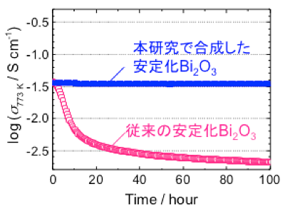 本研究で合成したBi2O3は100時間後もイオン伝導度を維持していることがわかる。