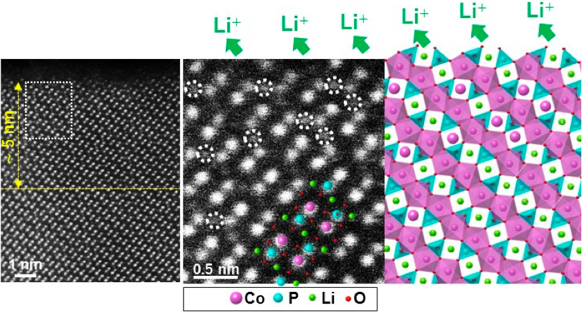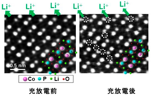 化学溶液法(注2)により配向したLiCoPO4正極膜を作製し、充放電前後の正極膜試料について、走査透過型電子顕微鏡を用いて構造解析を行いました。その結果、充放電により、正極膜表面から5nmの範囲で、一部のLiサイトに、原子サイズの大きなCo原子が置き換わっていること(破線丸)、酸素の欠損によりリン酸(PO4)四面体構造が歪むことが判明しました(下図参照)。これらの構造劣化がLiイオンの移動を阻害し、電池容量が低下する電池劣化のメカニズムであることを明らかにしました。このように電池材料の構造と特性との相関性を解析することにより、電池表面構造の改善に向けたプロセス設計に指針が得られ、長寿命で高機能な二次電池材料開発に繋がることが期待されます。