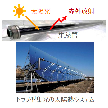 ステンレス管の外周面に下記の「光学選択吸収膜」を設けて太陽光を熱に変換する。一方、管内にはオイルや溶融塩などの熱媒体を流し、その熱媒が高温に加熱されて熱利用設備に送られる。