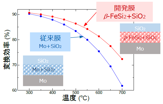 本研究にて設計・成膜した薄膜材料では、太陽光を吸収する半導体材料として、安全かつ安価な元素で構成される胃β-FeSi2を選定しました。その理由は、そのバンドギャップが太陽光の吸収に適するとともに、薄膜中にてナノ粒子として分散させることで光学特性をコントロールでき(図2 (a))、かつ高温でも安定となる膜構成を見出すことができたためです。その結果、従来の金属ナノ粒子を利用した光学選択吸収膜よりも優れた吸収特性を得ることができました(図1 (b))。つまり、太陽の波長帯の光はこのβ-FeSi2によってほぼ90%以上吸収されるとともに、赤外域ではこの半導体は吸収せずほぼ透過するため、金属層(図2 (a)ではモリブデンMo層)の低い吸収率(=低い赤外放射率)を活かせるため赤外放射損失がほとんどありません。その結果として、変換効率を向上させることに成功しました(図2 (b))。