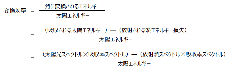 入射した太陽エネルギーに対する熱媒体を加熱した熱量の割合である。図1(b)に示した吸収率スペクトル(実測値)と、太陽光スペクトルおよび放射熱スペクトル(温度によって変化)から次式によって求めることができる。