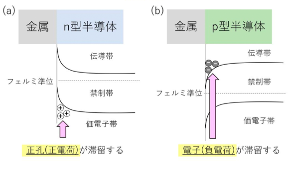 (a) 金属/n型半導体界面と (b) 金属/p型半導体界面に形成される空間電荷層。半導体の種類によって、空間電荷層の符号が異なり、電気特性が大きく異なる。(注意:厳密には、金属と半導体のフェルミ単位の位置関係でバンド構造が決まる)