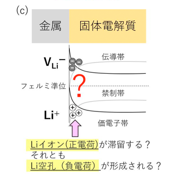 (c) 金属/Liイオン伝導性固体電解質界面のバンド構造。界面近傍でLiイオン(Li+)が滞留するのか、Li空孔(VLi-)が形成されるのか不明。固体電気化学反応の特性を大きく左右する領域である。