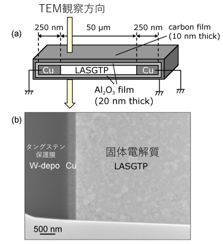 (a) 金属電極(Cu)/固体電解質(LASGTP)界面を観察するための断面TEM試料の模式図。 Al2O3絶縁膜+C導電膜により、帯電による影響を99%抑制できる。