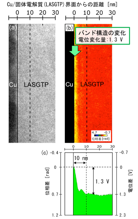 Cu/LASGTPの界面近傍の拡大写真を図4(a)に示します。この領域で位相シフト電子線ホログラフィー計測を行った結果を図4(b)に示します。この像は電位分布像に相当し、色が明るいほど電位が高いことを示しており、Cuとの界面近傍で色が明るくなっていることがわかります(図中、黄色部分)。図4(c)は図4(b)の横方向の強度変化を示します。Cu/LASGTPの界面近傍10 nmの領域で、急峻な電位の変化を捉えています。電位差は、1.3 Vと計測されました。