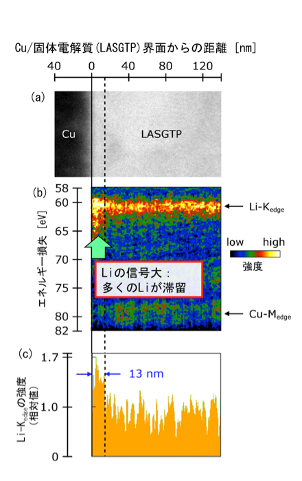 (b) 金属 (Cu) /固体電解質(LASGTP)界面近傍では、Liイオンが滞留し空間電荷層を形成することがわかった。