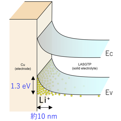 以上の観察結果により、Cu電極/LASGTP固体電解質界面では、図6のように、LASGTP内のバンド構造が湾曲し、約10 nmの領域で1.3 Vの電位変化(一般に、バンド図の縦軸はエネルギーの単位なので、1.3 eVに相当する)が生じていることがわかりました。これにより、この界面では図2(a)のようなバンド構造になり、界面近傍にLiイオン(正電荷)が滞留することによって、Liイオンの空間電荷層を形成していることが明らかになりました。