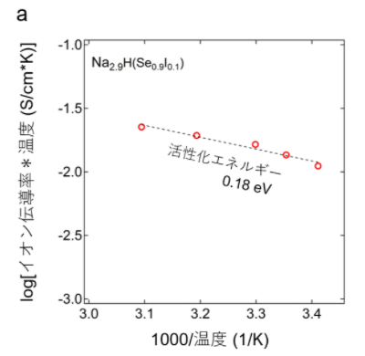 ここでヒドリドは八面体の中心に、カルコゲンは八面体の隙間に位置しています。よって、ソフトな(分極率の大きい)陰イオン格子の中にアルカリ金属イオンが存在するというイオン伝導体としては理想的な環境を実現することに成功したことになります。実際、同物質が優れたアルカリイオン伝導(例えば、Na2.9H(Se0.9I0.1)において1×10–4 S/cm)をもつことを示しました(図2a)。またイオン拡散の活性化エネルギーが非常に低い(例えば、Na3HSeで0.18 eV)ことを理論計算および実験で示すことに成功しました。