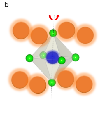 特に、ソフトなアニオン格子をもつことに由来してLi3HX、Na3HXには興味深い構造上の特徴がみられることを見出しました。既存の(逆)ペロブスカイト化合物はほとんどの場合、構成元素のイオン半径比に応じて理想的構造(立方晶)から歪んだ低対称な構造をとることが知られていますが、本物質ではイオン半径比の変化が大きいにも関わらず対称性の高い立方晶構造が維持されます。このことによって、リチウムまたはナトリウムからなる八面体が極めて低いエネルギーで回転できることが第一原理計算によりわかりました(図2b)。八面体の回転方向はアルカリ金属イオンの拡散方向と同じであることから、この低エネルギーの回転モードが同物質のイオン伝導を促進しているといえます。つまり、イオンは孤立して運動するのではなく、共奏的に運動することが本系では重要であると考えられます。