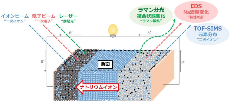 ●正極/固体電解質/負極の積層構造からなる全固体ナトリウム電池において、電池の動作下でラマン分光計測、走査電子顕微鏡観察および飛行時間型二次イオン質量分析を同一断面試料に適用するマルチスケール分析を構築しました。