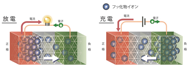 マイナスのフッ化物イオン(F–)が正極と負極の間を移動して充放電する蓄電池。