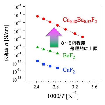 CaF2 や BaF2 単体ではフッ化物イオンは動きにくいのですが、CaF2 と BaF2 を原子レベルで混合し、フッ化物イオンの原子配列の乱れを誘発することで、フッ化物イオンが急激に動きやすくなることを明らかにしました。本系のイオン伝導メカニズムの解明によって、フッ化物イオン伝導体のイオンの流れに関する理解をより深めることができたと考えています。さらに本研究の成果が、革新型蓄電池(ポスト・リチウムイオン電池)の最有力候補の1つであるフッ化物電池の材料開発に大きく貢献することも期待されます。