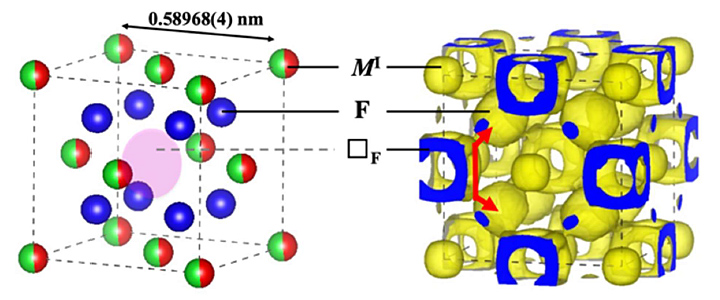 蛍石型構造をもつフッ化カルシウム(CaF2)やフッ化バリウム(BaF2)は、全固体フッ化物電池において重要な高電圧下での利用が期待されますが、その反面、イオン伝導率(※2)が低い物質です。CaF2 と BaF2 を原子レベルで混合することで、イオン伝導率が飛躍的に向上することが知られていましたが、CaF2–BaF2 系のフッ化物イオン(F–)の分布やその伝導メカニズムは不明のままでした。