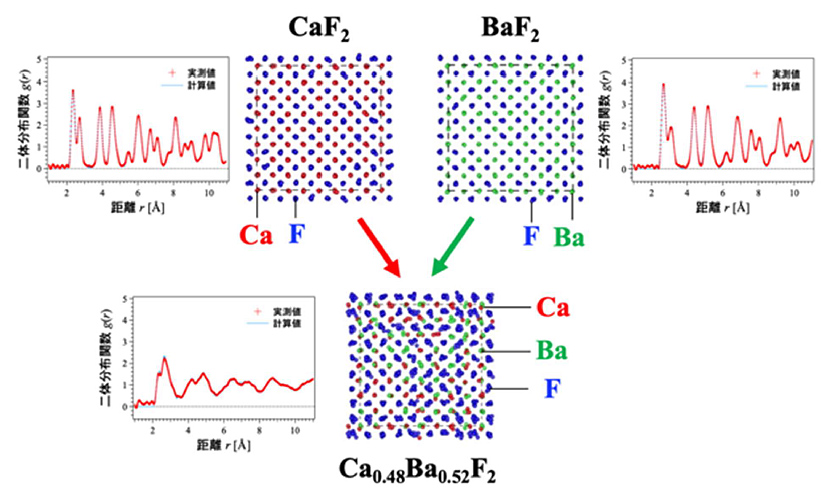 CaF2 や BaF2 を用いることで高電圧下での蓄電池の利用が期待できますが、イオン伝導率が低いため、単体で固体電解質として使用することはできません。一方、原子レベルで混合したCaF2–BaF2 系固体電解質は高いイオン伝導率を示すことが知られていましたが、詳細な原子配列やフッ化物イオン伝導経路など、不明な点が多く存在していました。