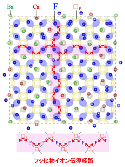 蛍石型構造をもつフッ化カルシウム (CaF2) やフッ化バリウム (BaF2) は、全固体フッ化物電池において重要な高電圧下での利用が期待されますが、その反面、イオン伝導率が低い物質です。CaF2 と BaF2 を原子レベルで混合することでイオン伝導率が飛躍的に向上することが知られていましたが、CaF2–BaF2 系のフッ化物イオン伝導メカニズムについては不明のままでした。