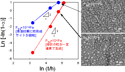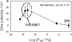 | 図1. 酸化材表面のゼータ電位と酸化時のPO2の関係 | 図2. 酸化材表面におけるAp被覆率(a)と擬似体液浸漬時間の関係 |