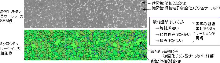 | ミクロシミュレーション例:炭窒化チタン基サーメット(固溶体粉使用)の液相量(結合相)を変えたときの組織の再現 |