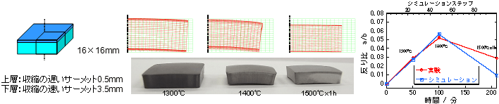 | マクロシミュレーション例:炭窒化チタン基サーメット積層体の焼結時の反り変形挙動を模擬 |